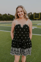 Turn heads in this black mini dress featuring delicate white embroidered florals and a scalloped hemline for the perfect mix of sweet and bold. The flattering babydoll fit and scalloped neckline give it a playful touch, while adjustable spaghetti straps keep it comfy all day. Whether you’re cheering on your team, headed to a concert, or styling it with boots for a night out, this dress is a game day essential you’ll love to wear again and again.